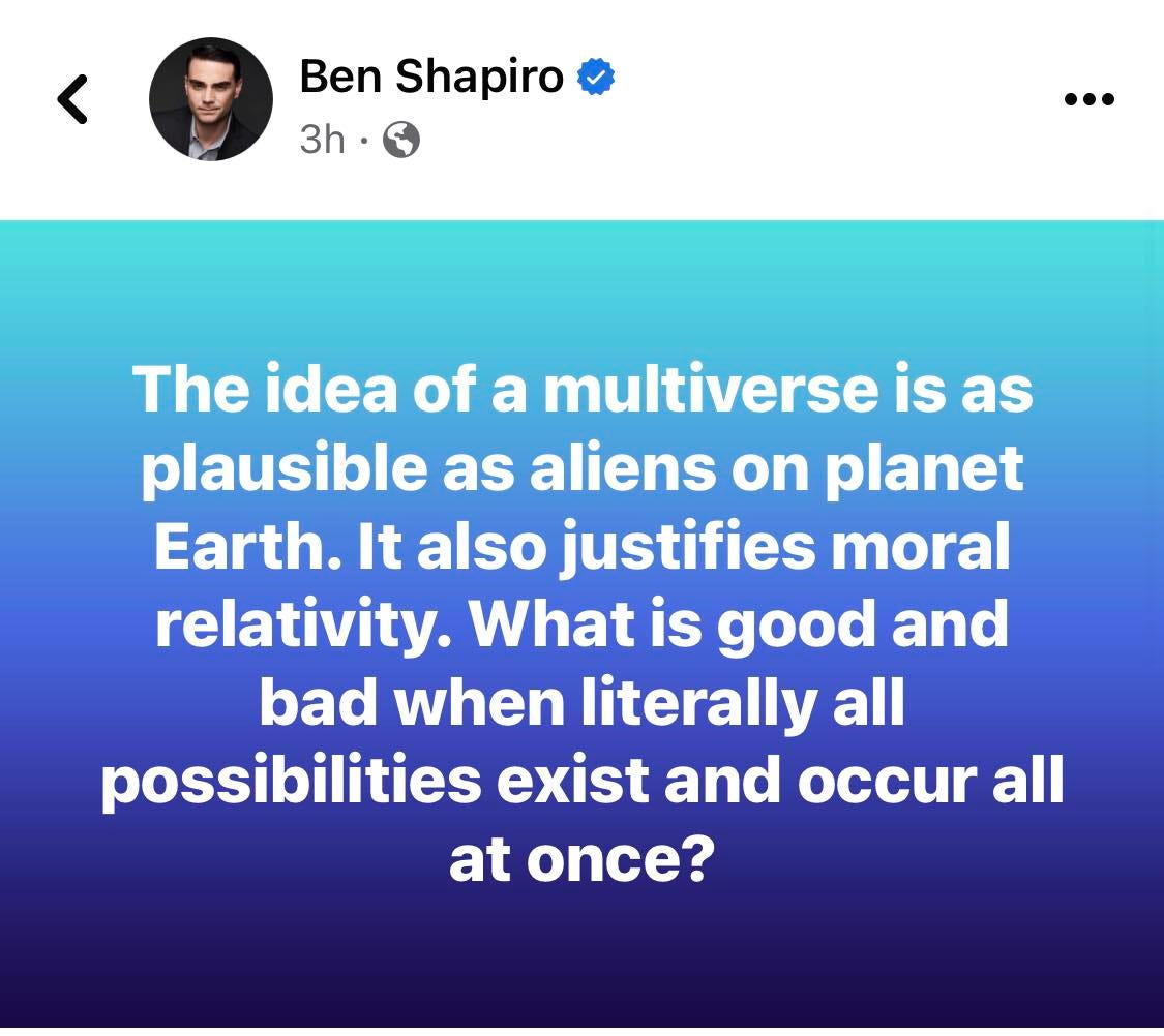Often as I appreciate what Shapiro has to say on many political and cultural issues, his comment about the multiverse and moral relativism was poorly thought out.
