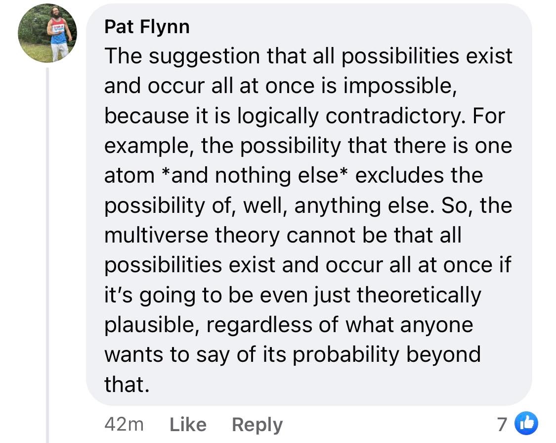 Finally, “all possibilities” is almost never what proponents of the multiverse are talking about. Multiverse theories (there ain’t just one — see my conversation with physicist Luke Barnes on this) come with considerable restriction and specification. So, unless Ben simply has Marvel movies in mind, as opposed to what actual physicists are talking about, then his post not only commits the non-sequitur fallacy, but the straw-man fallacy as well.